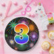 This fun, cheerful, and colourful paper plate design features a large number "3" having a rainbow spectrum gradient inspired pattern colouring. It also features a vibrant and exciting bursting celebratory fireworks inspired pattern. It has a black coloured background. Fun paper plates like this might be used at a celebration being held in honour of somebody’s third birthday, a third anniversary, or some other 3rd event. [~Z0000490]
