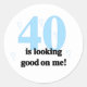 40 is Looking Good on Me T-shirts, mugs, buttons, cards, and other 40th birthday apparel and gift items with blue and black text design with tiny balloons.