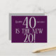 This is a cool 40th birthday quote print purple and silver postcard that says: '40 IS THE NEW 20! HAPPY BIRTHDAY!'