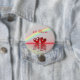Button with my design of two ruby red hearts floating on the water under a rainbow, with a red horizon and red customisable text that says "40 Years".