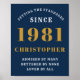 A personalised classic poster design for that birthday celebration for a special person born in 1981 and turning 40. Add the name to this vintage retro style blue and gold design for a custom 40th birthday gift. Easily edit the name and year with the template provided. A wonderful custom blue birthday gift. More gifts and party supplies for that 40th party celebration available in the store.