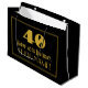 This 1920s-1930s look inspired vintage appearance birthday-themed gift bag design features a large art deco look inspired number "40", the message "Happy 40th Birthday,", a customisable name, and a border pattern consisting of thin lines. The background is coloured black. A gift bag like this might be used when wrapping presents being given to somebody in celebration of their fortieth birthday. [~Z0000501]