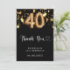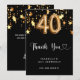 A thank you card for a 40th birthday. A black background colour. With faux gold stars. On front: number 40 written with a balloon style font. Thank You, your text, title and a date.