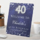 A welcome sign for a 40th birthday party. A navy blue background with elegant faux silver stars. The blue colour is uneven. Personalise and add a name and text. White letters.