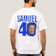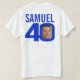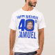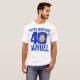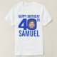 Happy 40th Birthday blue and white text, custom front, and back photo, and name t-shirt. Fun 40th personalised photo in bold blue and contrasting white birthday tee design. Personalise this birthday shirt with two photographs of the birthday person in the middle of the number 0 on the front and back ideal for a past and present photo opportunity. Great idea for adding some fun to a milestone fortieth birthday party, event, wave, or birthday drive by. Other matching items and colours are available. Exclusive design by Sarah Trett for www.mylittleeden.com