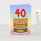 This upbeat and joyful birthday greeting card design features a cartoon-style depiction of a three-tier birthday cake having number-shaped candles on top showing the age “40“, along with the message “HAPPY 40TH BIRTHDAY,”, and a personalised recipient name. The background of the front features a multicolored pastel rainbow spectrum inspired gradient pattern. The inside features an editable birthday greeting message, or could perhaps be cleared and left blank if a message is to be written by hand instead. A colourful, personalised birthday greeting card like this might be used to acknowledge somebody’s fortieth birthday. [~Z0000625]