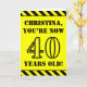 The front of this bold and attention-grabbing birthday themed greeting card design features a customizable name and the message "YOU’RE NOW 40 YEARS OLD!" in black stencil look text on a yellow colored background. There is also an eye-catching black and yellow striped pattern at the top and bottom edges of the front. The inside features an editable birthday greeting message, or could perhaps be cleared and left blank if a message is to be written by hand instead. A custom birthday card like this might be a fun way to send birthday wishes to somebody who is celebrating their fortieth birthday. [~Z0000413]