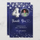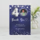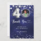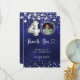 A thank you card for a 40th birthday. A navy blue background colour. The blue colour is uneven. With faux silver stars. Add your photo. On front: number 40 written with a balloon style font. Thank You, your text, title and a date.