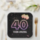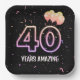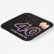 Party balloons and confetti on black background with the neon number 40 for a 40th birthday party.