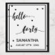 Elegant and modern for a 40th birthday party. White backdrop and black text written with a trendy hand-lettered style script: hello forty. With small black dots as decor. Templates for name and date, black letters. You can change the background colour to match your theme. Click customise and then "select a background colour" on your right.