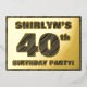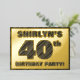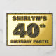 The front of this bold fortieth birthday celebration foil invitation card features a personalised name, a large number “40th”, the message “BIRTHDAY PARTY!”, and a border, all featuring a rustic, yet sophisticated, faux wood grain appearance inspired pattern. The back features personalised details about the event, such as the date, time, location, and any other important information. Editable invitations like these might be used to invite attendees/guests to a birthday party/gathering being held in celebration of somebody’s 40th birthday. [~Z0000595]