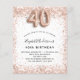 For an elegant 40th birthday. A white background. Decorated with rose gold, pink faux glitter, sparkles. Personalise and add a name, and party details. The name is written with a hand lettered style script, number 40 with balloon style fonts.
