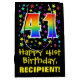 This exciting, fun, and colourful birthday themed gift bag design features a large number "41" with a rainbow spectrum gradient style pattern, along with the message "Happy 41st Birthday,", and a customisable recipient name. It also has a background pattern featuring star shapes of various sizes and colours. A gift bag like this might be used when giving a gift or present in honour of somebody’s 41st birthday. [~Z0000510]