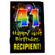 This fun, exciting, and colourful birthday giftbag design features a large number "41" with a rainbow spectrum gradient inspired pattern, along with the message "Happy 41st Birthday,", and a custom recipient name. It also features a colourful background pattern inspired by the look of bursting celebratory fireworks. A gift bag like this might be used when wrapping gifts being given to somebody in celebration of their 41st birthday. [~Z0000509]