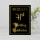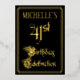 The front of this elegant and ornate foil forty-first birthday celebration/party invitation design features the message “41st Birthday Celebration” in opulent script-style text. It also has a customisable name. The background of the front is coloured black by default (although it can be customised to a different colour). The back features personalised details about the event, such as the date, time, location, and any other information that may be relevant. Opulent, luxurious, personalised invitations like these might be used to invite guests to a birthday party being held to celebrate somebody’s forty first birthday. [~Z0000589]