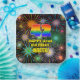 This upbeat and joyful birthday themed paper plate design features a large number “42” with a colourful rainbow spectrum inspired gradient pattern, along with the message “HAPPY 42nd BIRTHDAY,”, and a custom name. The background of the front features an eye-catching, colourful pattern that resembles bursting celebratory fireworks. Exciting birthday themed paper plates like this might be used at a party for somebody who is celebrating their 42nd birthday. [~Z0000604]