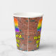 This vibrant and exciting urban graffiti and street art themed birthday paper cup design features a large number “42” with a colourful rainbow spectrum gradient inspired pattern, along with the message “Happy 42nd Birthday,”, and a personalised name. The background features a brick wall pattern. Colourful, vibrant paper cups like this might be fun to have at a birthday celebration/party being held in celebration of somebody’s 42nd birthday. [~Z0000543]