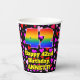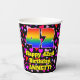 This cheerful and colourful birthday themed paper cup design features a large number “42” with a rainbow spectrum gradient inspired pattern, along with the message “Happy 42nd Birthday,”, and a customisable name. The background features a pattern of purple, pink, and red heart shapes of various sizes. Friendly, loving paper cups like this might be fun to have at a birthday celebration being held to honour somebody’s 42nd birthday. [~Z0000548]