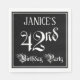 This fancy and elaborate birthday paper napkin design features a customizable name and the message “42nd Birthday Party”. The large number “42nd” and the words “Birthday Party” are in elegant script-style text. The background is colored black by default (although it can be customized). Fancy, luxurious paper napkins like this might be useful to have at a birthday party/celebration being held in celebration of somebody’s forty second birthday. [~Z0000563]