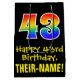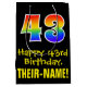 This fun, exciting, and colourful birthday-themed giftbag design features a large number "43" with a rainbow spectrum gradient inspired pattern, along with the message "Happy 43rd Birthday,", and a custom recipient name. It also has a black-coloured background. A fun giftbag like this might be used when wrapping presents being given to somebody in celebration of their 43rd birthday. [~Z0000512]
