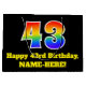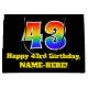 This colourful and fun birthday themed gift bag design features a large number "43" having a rainbow spectrum gradient inspired pattern. It also features the message "Happy 43rd Birthday,", and a customisable name. It also has a black-coloured background. A vibrant birthday themed gift bag like this might be a fun way to wrap a gift or present being given to somebody who is celebrating their 43rd birthday. [~Z0000521]