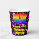 This cheerful and colourful birthday themed paper cup design features a large number “43” having a rainbow spectrum gradient inspired pattern. It also features the message “Happy 43rd Birthday,”, and a custom name. The background features a pattern of purple, red, and pink heart shapes. Loving, upbeat paper cups like this might be fun to have at a birthday celebration being held in celebration of somebody’s forty third birthday. [~Z0000548]