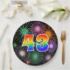 This cheerful, fun, and colourful paper plate design features a large number "43" having a rainbow spectrum gradient inspired pattern colouring. It also features a vibrant and exciting bursting celebratory fireworks inspired pattern. The background is coloured black. Paper plates like this might be fun to use at a celebration being held to honour somebody who is celebrating their forty third birthday, a forty third anniversary, or some other forty third event. [~Z0000490]