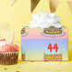 This colourful and upbeat birthday wrapping paper design features a cartoon-style depiction of a three-tier birthday cake having number-shaped candles on top showing the age “44“, along with the message “HAPPY 44TH BIRTHDAY,”, and an editable recipient name. The background has a multicolored pastel rainbow spectrum inspired gradient pattern. Wrapping paper like this might be used when wrapping gifts being given to somebody in celebration of their forty fourth birthday. [~Z0000622]