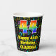 This joyful and exciting music themed birthday paper cup design features a large number “44” with a rainbow spectrum gradient inspired pattern, along with the message “Happy 44th Birthday,”, and a custom name. The background features a vibrant and colourful pattern having music notes and symbols of various sizes and colours. Colourful, vibrant paper cups like this might be fun to use at a birthday celebration/party being held to honour somebody’s forty fourth birthday. [~Z0000541]