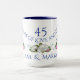 4th wedding anniversary keepsake mug with white roses, pink blossoms and bluebell flowers. 45 years of love and life with custom names. All text may be personalised. Check out other products with this lovely design in the Anniversary section of my studio store on Zazzle site.