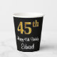 This stylish, sophisticated, and luxurious birthday paper cup design features a large ordinal number “45th” having an imitation/faux gold-like appearance, plus the birthday greeting message “Happy 45th Birthday,” and an editable name in a script-style font. The background is coloured black. Paper cups like this might be use at a birthday party for somebody who is celebrating their 45th birthday. [~Z0000538]