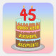 This upbeat and joyful birthday square sticker design features a cartoon-style depiction of a three-tier birthday cake having numeral-shaped candles on top showing the number “45“, along with the message “HAPPY 45TH BIRTHDAY,”, and a customizable recipient name. The background features a multicolored pastel rainbow spectrum inspired gradient pattern. Birthday themed stickers like these might be used or given out at a party celebrating somebody’s forty fifth birthday, or perhaps used when preparing invitations or gifts for such an event. [~Z0000624]