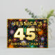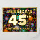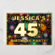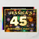 The front of this eye-catching and exciting forty-fifth birthday party/celebration foil invitation card design features a customisable name, a large number “45th”, the message “BIRTHDAY PARTY!”, and a border. The background of the front features a joyful, multicolored pattern inspired by bursting celebratory fireworks. The back features personalised details about the event, such as the date, time, location, and any other important information. Customised invitations like these might be a fun way to invite attendees to a birthday party/gathering being held to celebrate somebody’s 45th birthday. [~Z0000602]