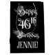This luxurious and formal birthday-themed gift bag design features the message “Happy 46th Birthday,” in elaborate script style text, on a black coloured background. It also features an editable recipient name. A birthday themed gift-bag like this might be used when giving a gift or present in celebration of somebody’s 46th birthday. [~Z0000557]