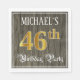 This fancy and ornate birthday paper napkin design features a customisable name and the message “46th Birthday Party”. The large number “46th” has an imitation/faux gold-inspired colouring pattern, the words “Birthday Party” are in elegant script-style text, and the background features an imitation/faux woodgrain-inspired pattern. Elegant, luxurious paper napkins like this might be used at a birthday celebration/party being held to honour somebody’s 46th birthday. [~Z0000566]