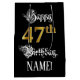This elegant and ornate birthday-themed gift bag design features the message “Happy 47th Birthday,”, plus a customisable recipient name. Some of the message is in a luxurious script-style text. The large number “47th” features a faux/imitation gold-inspired look pattern. The background is coloured black. A gift-bag like this might be a respectable way of wrapping a birthday present or gift being given to somebody who is celebrating their forty seventh birthday. [~Z0000560]