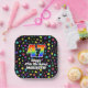 This fun and colorful birthday themed paper plate design features a large number “47” having a rainbow spectrum gradient inspired pattern. It also features the message “Happy 47th Birthday,”, and a personalized name. The background features a colorful pattern featuring many star shapes with different colors and sizes. Paper plates like this might be used at a birthday party held in celebration of somebody’s 47th birthday. [~Z0000582]