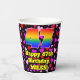 This joyful and happy birthday themed paper cup design features a large number “47” having a rainbow spectrum gradient inspired pattern. It also features the message “Happy 47th Birthday,”, and a customisable name. The background features a pattern of heart shapes with colours like purple, pink, and red. Cheerful, friendly paper cups like this might be fun to have at a birthday party/celebration being held to honour somebody’s 47th birthday. [~Z0000548]