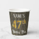 This opulent and elegant birthday themed paper cup design features a customisable name and the message “47th Birthday Party”. The large number “47th” has an imitation/faux gold-inspired colouring pattern, the words “Birthday Party” are in ornate script-style text, and the background features an imitation/faux woodgrain-inspired look. Luxurious, fancy paper cups like this might be used at a birthday party/celebration being held in celebration of somebody’s forty seventh birthday. [~Z0000568]
