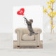 Tabby cat standing on a leather chair playing with a red heart balloon for 49th birthday.