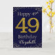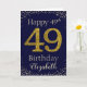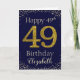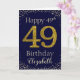 Happy Birthday with simulated golden glitter number 49 set on a solid colour and framed by faux diamonds and rhinestones. Happy birthday and recipients name in off-white font. Personalise with name or message.