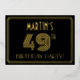 The front of this 1920s/1930s style inspired forty-ninth birthday party/celebration foil invitation features a customisable name, a large art deco style inspired number “49TH”, the message “BIRTHDAY PARTY!”, and a border pattern consisting of lines. The front also has a black-coloured background by default, but it can be customised to a different colour if desired. The back features personalised details about the event, such as the date, time, location, and any other information that may be relevant. Luxurious, elegant, customised invitations like these might be used to invite guests to a birthday party/celebration being held in celebration of somebody’s 49th birthday. [~Z0000590]