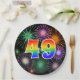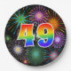 This cheerful, colourful, and fun paper plate design features a large number "49" coloured with a rainbow spectrum gradient inspired pattern. It also features a exciting and vibrant bursting celebratory fireworks inspired pattern. The background is coloured black. Fun paper plates like this might be used at a celebration being held to observe somebody’s forty ninth birthday, a 49th anniversary, or some other 49th event. [~Z0000490]