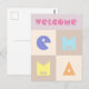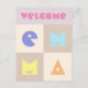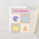Four letter baby girl name congratulation card for a newborn baby and its parents in neutral pastel light pink lila beige colours. The 4 letters are customisable adjusting to the kids name. The letters are chosen in a cute font so that it looks childishly figurative.