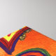 A small purple heart is enclosed by a red heart that is within orange hearts. The hearts are outlined in green, purple, and red. The watercolor background is a soft yellow with colourful confetti dots. A light layer of gold and red glitter traces the heart edges. Painting detail from Inspirational Word "Happy" artwork.