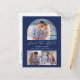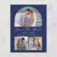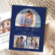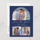 This simple, minimalist Save the Date postcard features an arch-shaped photo at the top and two smaller square photos at the bottom. In between, the words "Save the Date" appear in elegant white handwriting script, followed by the couple's names, wedding date and city in sans serif font on a navy blue background. Add a fourth, horizontal photo to the back, along with your return address and additional details.