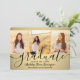 Share the joy of a high school or college graduation with these custom 4 photo collage black and gold announcements. All pictures and wording are simple to personalise. (IMAGE PLACEMENT TIP: An easy way to centre a photo exactly how you want is to crop it before uploading to the Zazzle website.) This template can be customised with any details of your choice, such as party invitation info, parents' names, special honours, degree title, favourite inspirational quote, graduate's new address / contact info, future education plans, or new job position. If there's any text not wanted simply delete it. Design features a faux foil background, black mortar board cap, handwritten style script calligraphy, modern minimalist typography, and four photos of your choice, such as senior pictures or images from the commencement ceremony. Please note that gold is printed colour, not metallic foil.These elegant graduation announcement cards are a trendy and chic way to share your special day celebration with family and friends. Congratulations to the graduate!