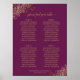This beautiful 4 table wedding seating chart includes table assignments for 40 guests, with 10 people at each table. The design is simple yet elegant with gold text on a magenta or cassis purple background and features lacy floral filigree in the corners and a fancy script calligraphy title reading "please find your table." Sophisticated and chic.