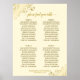 This beautiful 4 table wedding seating chart includes table assignments for 40 guests, with 10 people at each table. The design is simple yet elegant with gold text on a cream or ivory coloured background and features lacy floral filigree in the corners and a fancy script calligraphy title reading "please find your table." Sophisticated and chic.