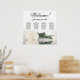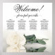 This stunning wedding seating chart has four tables with 10 seats per table, accommodating a total of 40 guests. The chart is adorned with a sophisticated and romantic design, featuring a single long-stemmed rose in an ivory, white, or pale cream colour, delicately resting on its side and casting a reflection in a serene pool of water. The chart's title, written in graceful script calligraphy, warmly welcomes guests with "Welcome! Please find your table" while leaving ample space below for the names of the couple and wedding date. This elegant seating chart serves as a charming and practical way to greet and assist your guests in finding their designated seats at your wedding reception.